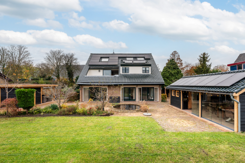 De achtertuin is gelegen op het oosten en fraai aangelegd met sierbestrating, groene borders, en een sfeervolle overkapping. Achterin de tuin staat de royale vrijstaande stenen garage met een vide voor extra bergruimte. De garage beschikt over een elektrische kanteldeur met loopdeur, elektra en verlichting. Via de garage bereikt u het mandelige achterterrein, dat is afgesloten met een elektrisch hek en waar ruimte is voor het parkeren van een tweede auto.